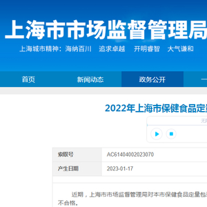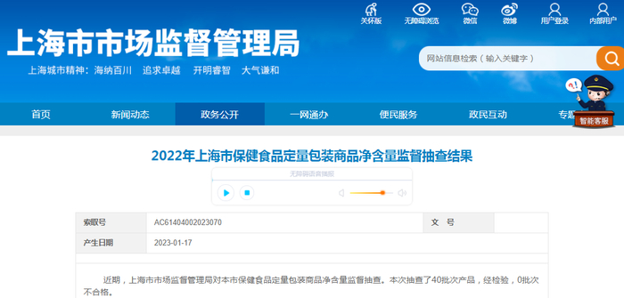 中国质量新闻网讯近日,上海市市场监督管理局发布2022年上海市保健食品定量包装商品净含量监督抽查结果。