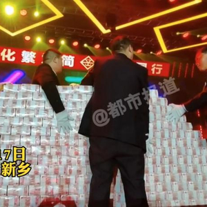 1月17日,河南一公司的年会上,企业负责人向员工现场发放奖金,6100万现金在舞台两侧垒成小山,员工成捆领取。在现场的视频中,一位员工手捧现金,没抱好,一捆现金掉落在地上。