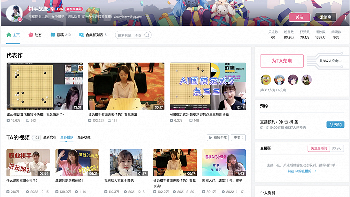 在围棋上造诣有限,但战鹰在直播领域找到了新生。2020年就开始直播的战鹰,在持续长达两年半的直播之后,突然找到了流量密码,并一举开启了围棋的大直播时代。频频与她联动的“八冠王”柯洁早在B站直播界有了一席之地,而紧随其后的连笑、唐韦星等选手,也吃到了这一波流量的红利,顺利将围棋这一小众的领域,带至相对更加大众的B站直播间里。