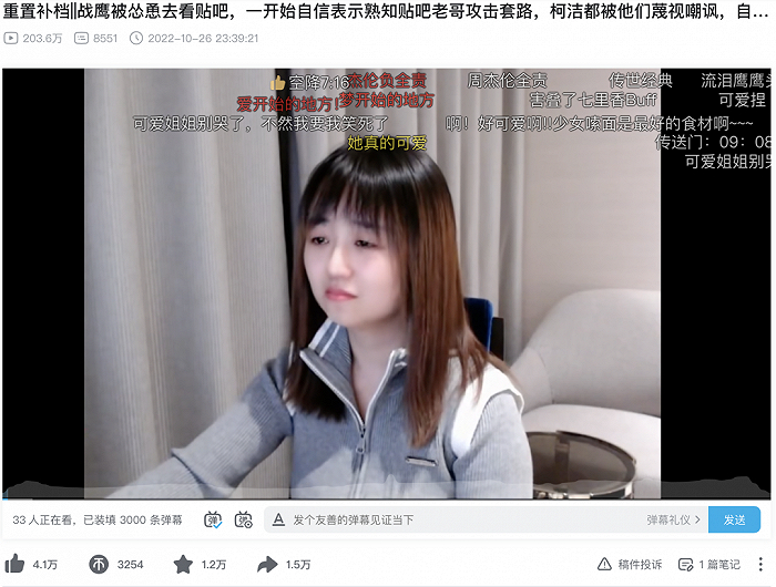 事件发生在十月底,彼时的棋手战鹰在B站仅有5万粉丝,直播间的观众数量也更加圈层,以围棋爱好者为主。在一场直播中,有观众怂恿战鹰去贴吧观看吧友对她的评价,战鹰欣然赴约,但在大量毫不避讳的差评中,她的心理防线还是被击溃了,最终战鹰泪洒直播间并立刻下播。