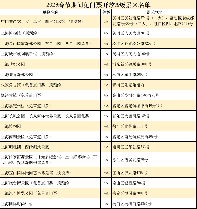 春节假期,上海33家景区景点票价优惠、68家A级景区免门票