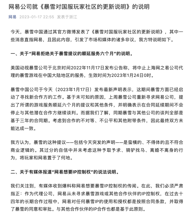 1月17日晚间,网易就先前暴雪公告中提出的“网易拒绝暴雪顺延服务六个月”、“网易想要IP控制权”等言论进行了澄清。