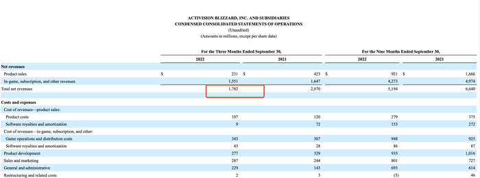 据动视暴雪2022年第三季度财报显示,公司净营收17.8亿美元,同比减少14%;净利润4.35亿美元,同比减少32%。公司月活跃用户3.68亿,同比减少5.9%。