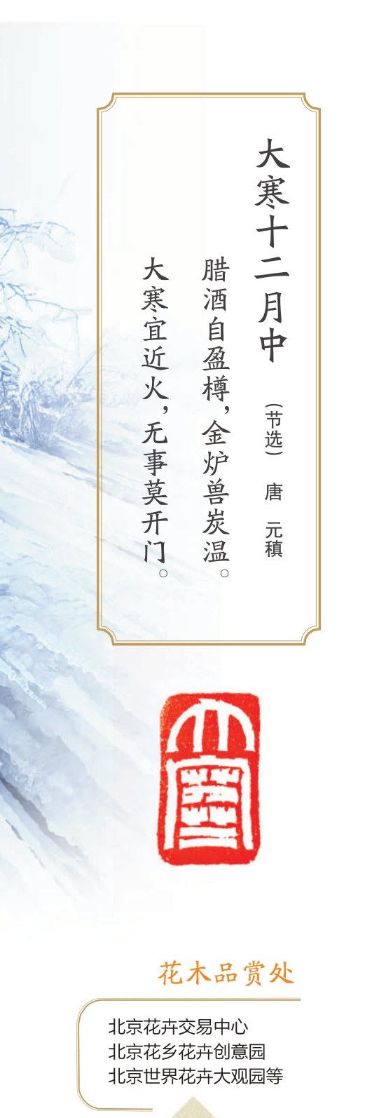 大寒是二十四节气中的最后一个节气,如其所名,大自然真正是到了一年中最寒冷的时节,所谓“水泽腹坚”,冰已经从表至里冻得相当厚实了。