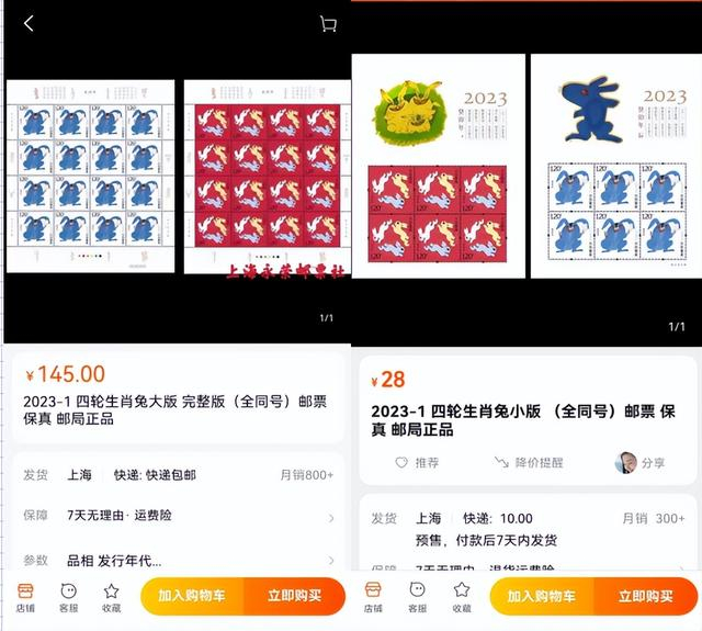 (交易平台上,一套大版票售价145元(左图)、小版票(右图)售价28元)