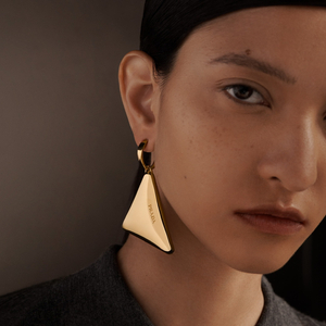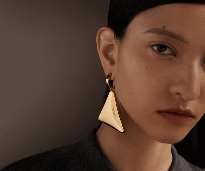 该系列共有48件主打⻩金材质的精品珠宝,其中有10件开放定制化设计。尽管每一件产品依然考虑到展示品牌特点而融入了普拉达标志性的三⻆徽标图案,但Timothy Iwata的每一个设计本身有更强的独立性和雕塑感,性别二分法在其中也被弱化。