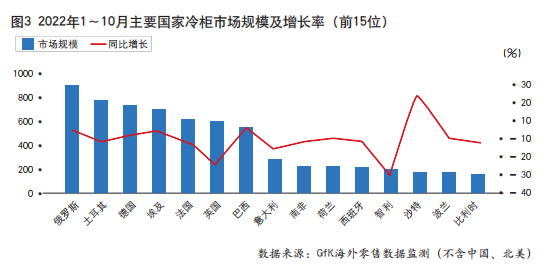 然而,从市场容量来看,冷柜市场容量排名前三位的国家是俄罗斯、土耳其和德国。埃及、法国、英国,巴西的冷柜容量也在第一梯队(见图3)。比较各国市场销量增长率可以看到,增长率较高的国家同样值得关注,如沙特冷柜市场2022年1~10月增长率达到23%。