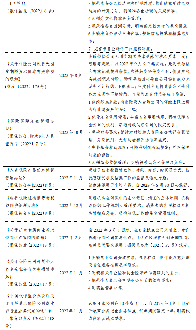 行业监管方面,2022年,银保监会继续发布修订行业监管规则,涉及非现场监管、公司治理、准备金评估、资金运用和关联交易等多个方面,完善监管系统,提升监管效率,加大违规行为惩处力度,继续引导保险公司合规经营,加强风险防范,提升公司及行业抵御风险能力。另一方面,监管部门持续推进新业务试点,引导保险公司加大对实体经济支持力度,包括引导保险公司参与我国多层次养老保障体系建设,丰富养老保险产品供给;鼓励保险资金对国家战略领域及重大项目提供资金支持等。此外,银保监会发布多项管理办法及征求意见稿,预计未来相关政策及配套细则将陆续出台。