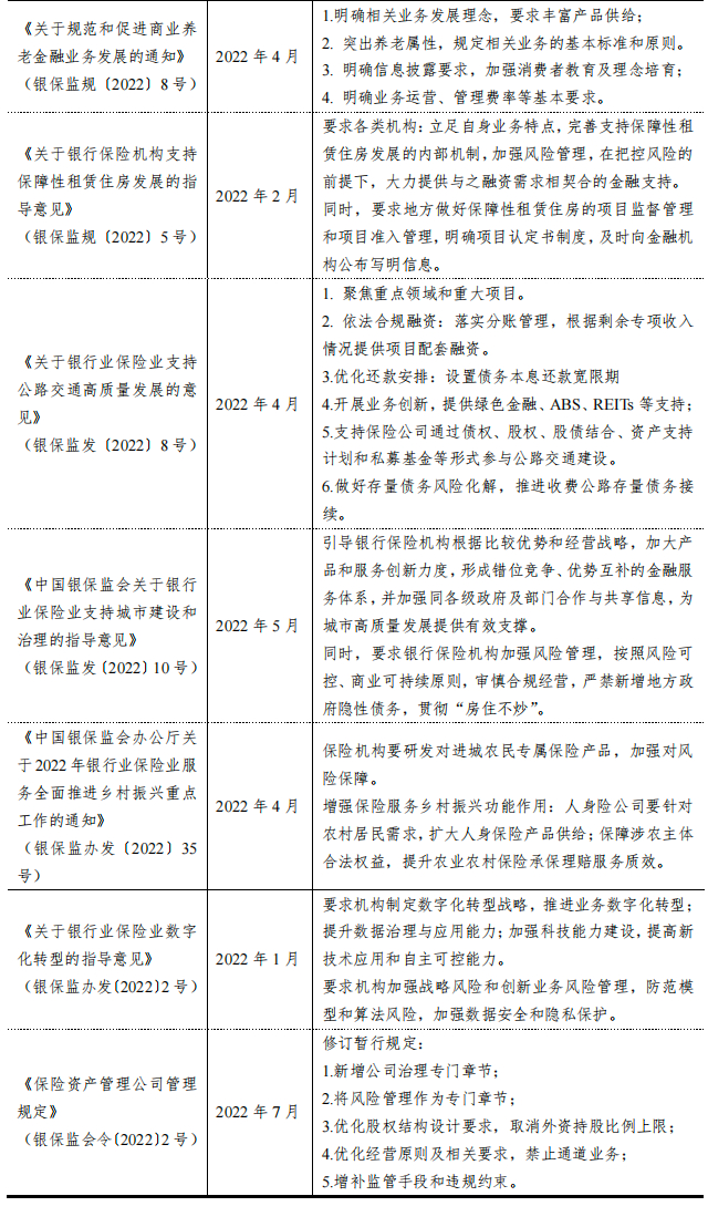 2022年以来,银保监会修订、发布多项政策规章,加强保险业风险防范,引导保险公司高质量发展。风险防范类监管政策修订主要涉及非现场监管、公司治理、关联交易监管、责任准备金监管、保险资金运用和保险保障基金等多个领域方面,旨在优化风险识别和监管措施,加强行业抵御风险能力。高质量发展方面,除坚持回归保险本源的政策导向外,监管部门一方面以人民权益保障为核心,发布多项规章,落实保险公司在消费者权益保护和信息披露等方面的主体责任,并引导保险公司推进个人养老和商业保险等方面工作,丰富风险保障类产品供给;另一方面,监管部门发布多项通知,引导保险资金运用融入国家发展战略,在风险可控的前提下,为重点领域提供多种模式的金融服务,加大对实体经济支持力度和支持效率。