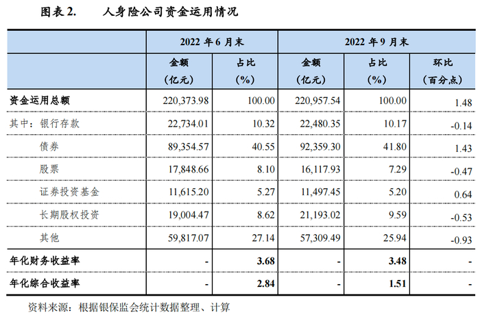 资金运用方面,2022年,保险行业资金运用总规模保持增长,其中人身险公司资金运用增速略高于行业增速。2022年9月末,保险行业资金运用余额为247088.14亿元,同比增长9.29%,其中人身险公司资金运用余额为221,706.93亿元,同比增长11.11%,占保险行业资金运用总额的90.09%。资金运用收益率方面,受市场波动、利率下行和资产荒影响,人身险公司2022年前三季度资金运用收益率下降。2022年前三季度,人身险公司资金运用年化财务收益率为3.48%,年化综合收益率为1.51%,不及今年上半年收益表现。