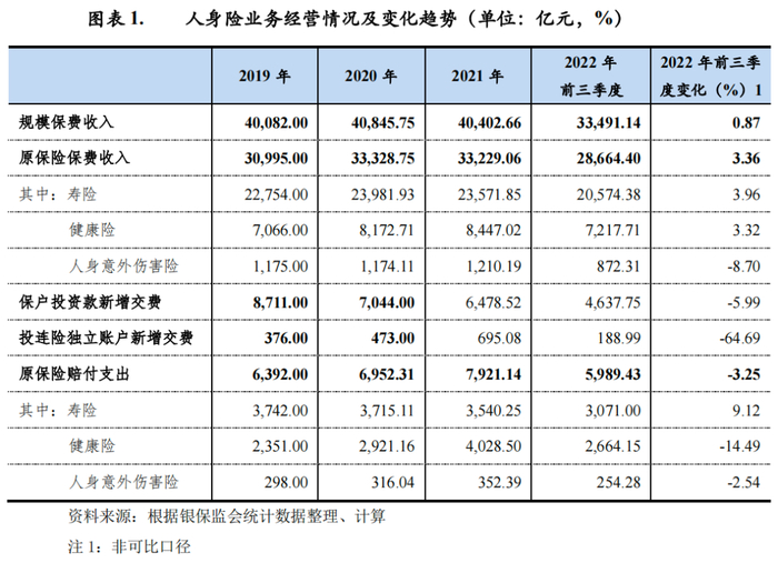 保费收入方面,2020年以来,受新冠疫情及宏观经济下行等多重因素影响,人身险行业保费收入增速放缓,从业人员脱落或尚未恢复,预计风险保障类业务仍将保持增长。长期储蓄类产品保费增长短期内受居民资产配置需求及利率走向预期、与同类金融产品的比较优势和证券市场行情等多因素影响。在银行理财产品净值化转型后,利率市场波动对其估值和时点收益影响较大,时点性亏损时有发生;而相应的传统年金类产品可锁定3.5%长期利率,相关保险产品的吸引力将有所提升。近年来,随居民健康保障意识提升,健康险业务保持较快增长,对原保费收入贡献度持续提升,预计2023年健康险业务将保持增长,但增速或将有所放缓。受监管导向影响,近年来万能险新增缴费相对增速较缓,业务占比持续下降。竞争格局方面,由于长期限保障类产品往往具有一定排他性,先发优势显著,步伐较慢的公司受制于缺乏业务积累,市场认可度偏低,代理人队伍维持也较为困难,行业分化或将进一步加大。
