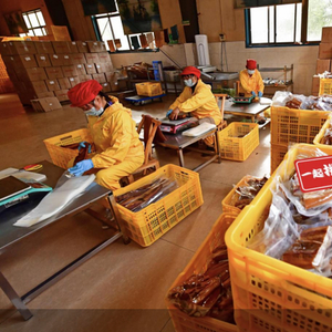 △拼多多年货节期间,“皇厨婶”店铺湖南腊制品销量上涨40%,工人们加紧打包发货。摄影/王伟