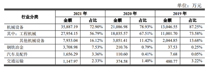 工程机械是树根互联最初的主打行业领域,不过,随着树根互联近些年在其他行业逐步渗透,工程机械领域的收入占总收入的比例分别为 73.58%、67.51% 和 56.79%,呈逐年下降趋势,其他机械设备、钢铁冶金、汽车及配件、交通运输等行业呈快速增长趋势,报告期内复合增长率分别为 97%、894%、1369% 和 55%。