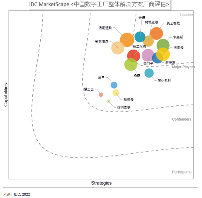 无独有偶的是,国际权威研究机构 IDC 也关注到了这样的前沿趋势,其在不久前首次发布《IDC MarketScape:中国数字工厂整体解决方案 2022 年厂商评估》,从现有能力、未来战略 2 个维度,对中国数字工厂整体解决方案厂商进行分析研究,并在众多参评者中遴选出 16 家优秀数字工厂整体解决方案服务商,为工业企业实践数字化提供参考。其中,树根互联凭借数字工厂操作系统及领先实践、未来发展战略等出色表现,成功上榜并位居 IDC 数字工厂领导者象限。