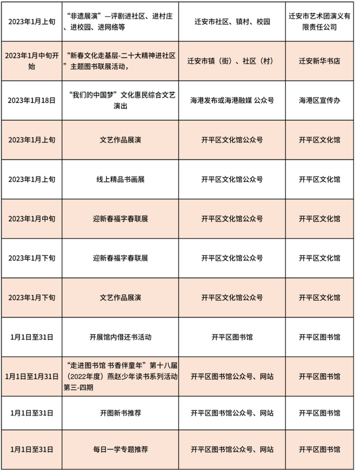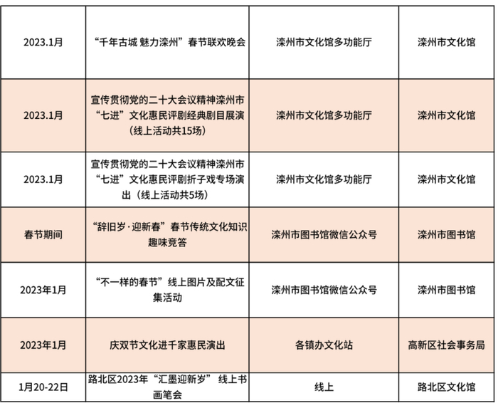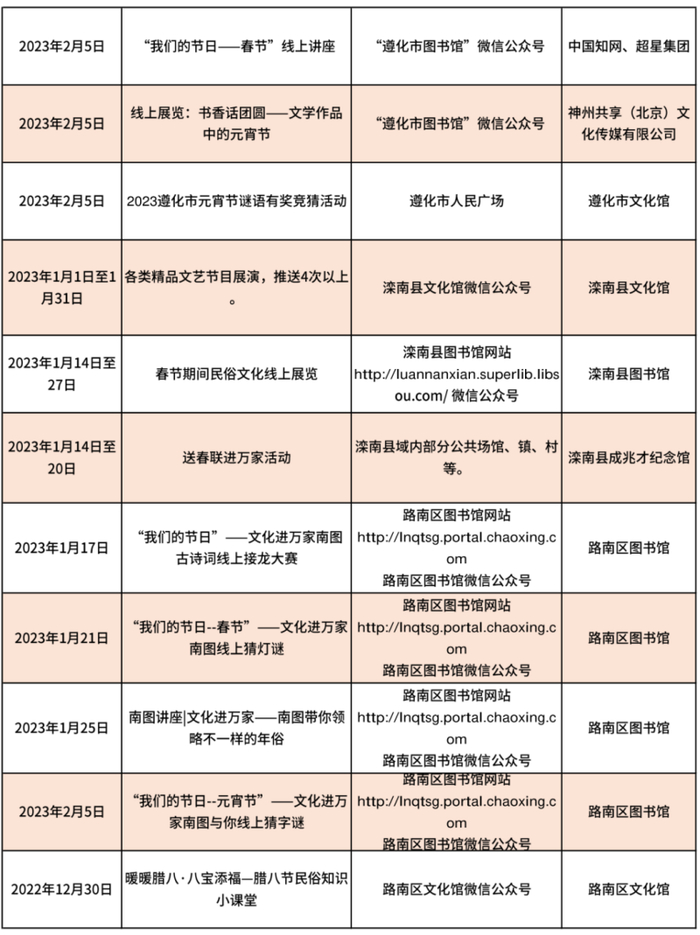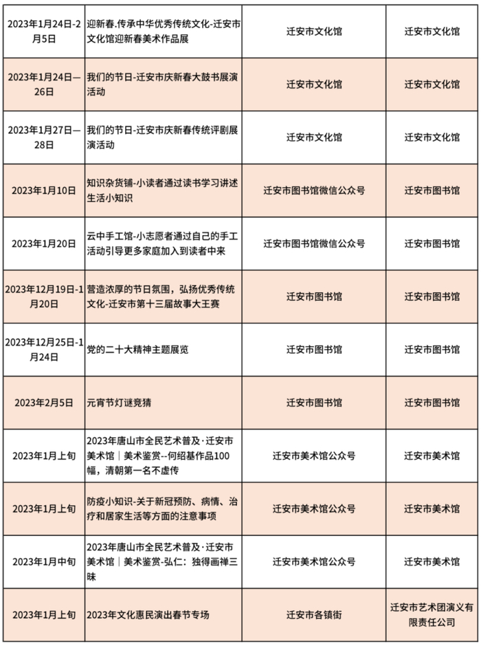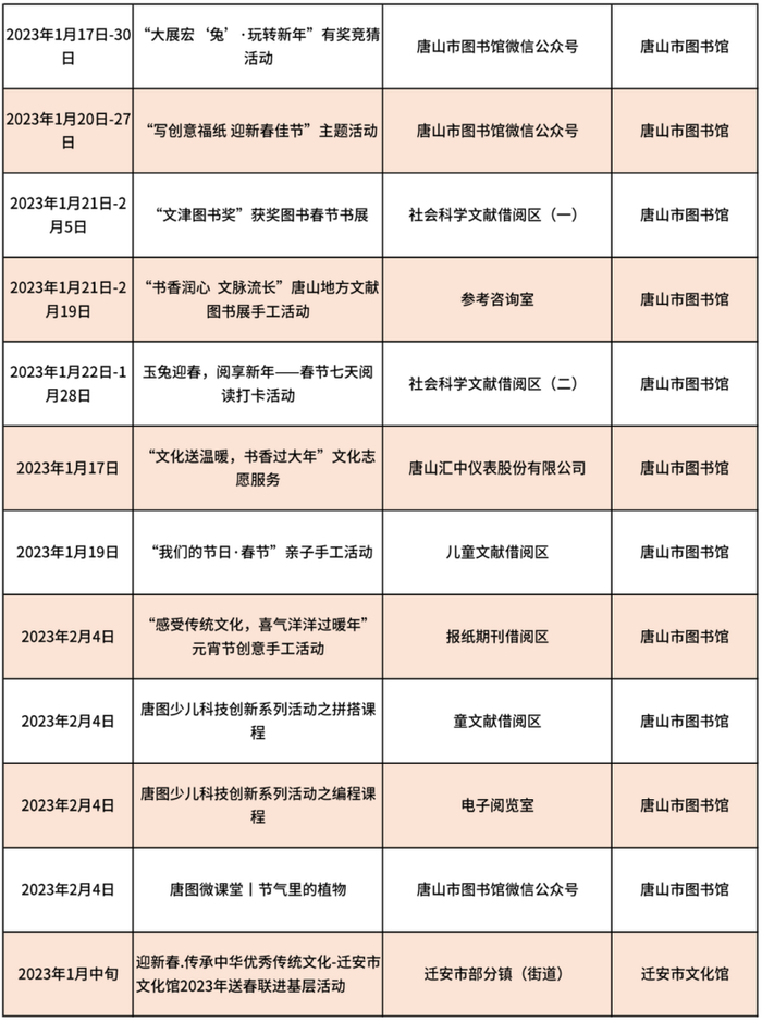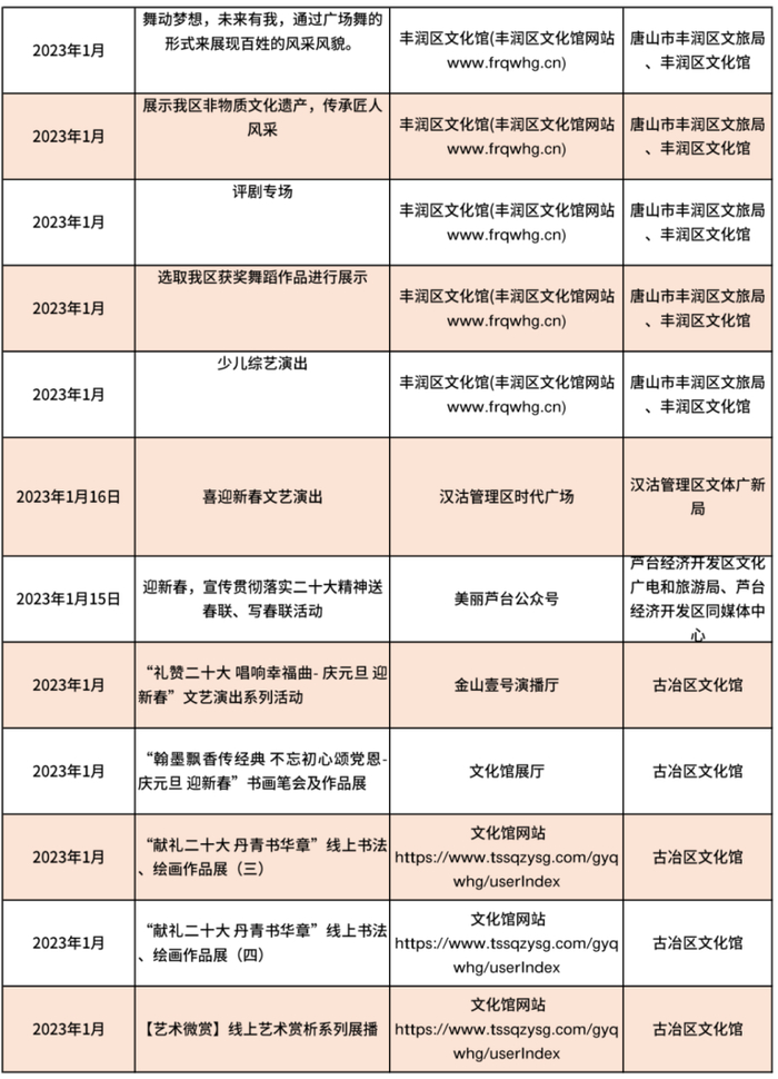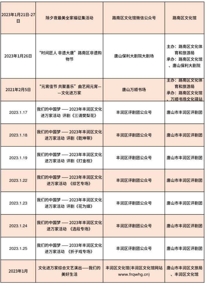 唐山市2023年春节期间文化活动信息汇总表