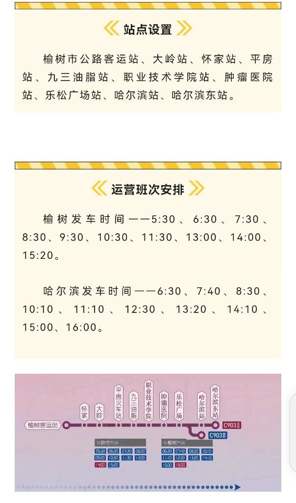 近日,东北三省首条省际公交——榆树至哈尔滨C903路开通运营!该线路双向日发班次20个,全程票价25元/人。