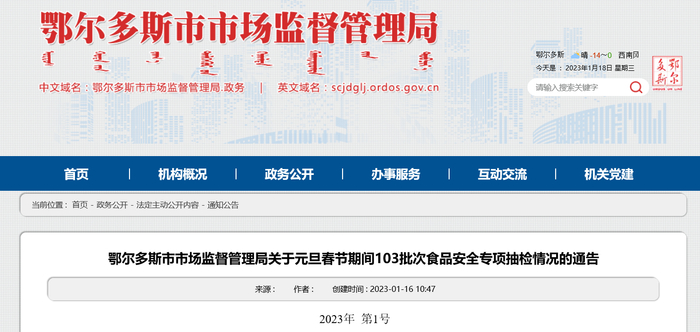 内蒙古鄂尔多斯市市场监督管理局公布元旦春节期间103批次食品安全专项抽检情况