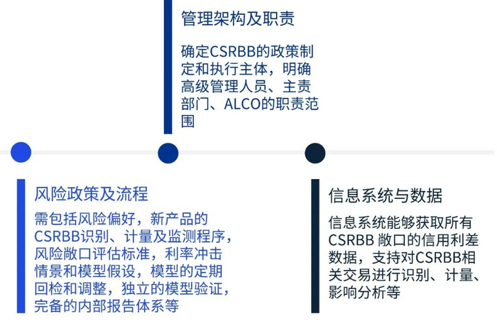 EBA从管理架构、制度流程、系统数据方面对CSRBB管理提出了以下原则性要求: