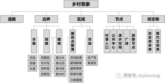 美国规划学者凯文•林奇将人们对城市的印象归纳为5种元素:道路、边界、区域、节点、地标。他认为城市设计应该强化这些印象,并建议将意象分析法作为任何一座城市未来视觉形式规划的基础。借鉴城市意象分析方法,在美丽乡村建设的同时也可以通过提炼并强化相关的空间要素来进一步加强乡村意象的构建,增加可识别性。