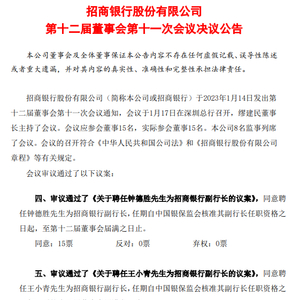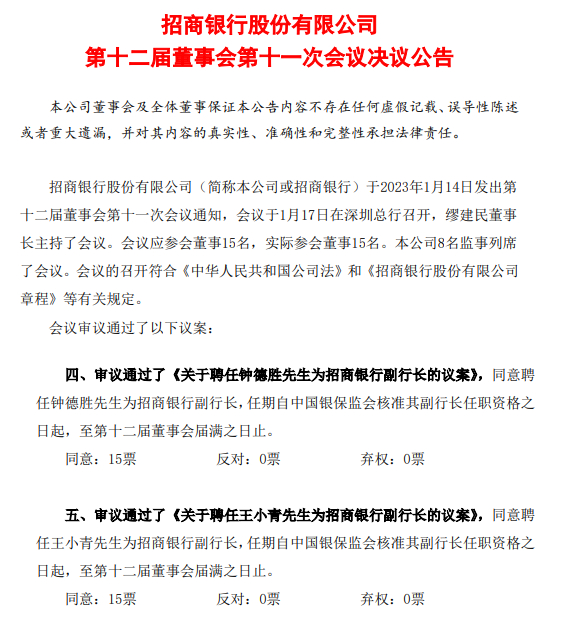 1月17日,招商银行发布第十二届董事会第十一次会议决议公告称,该行董事会已选举孙云飞为副董事长,提名黄坚为非执行董事候选人,并同意聘任钟德胜、王小青为该行副行长,两者任期自银保监会核准其副行长任职资格之日起,至该行第十二届董事会届满之日止。