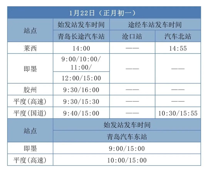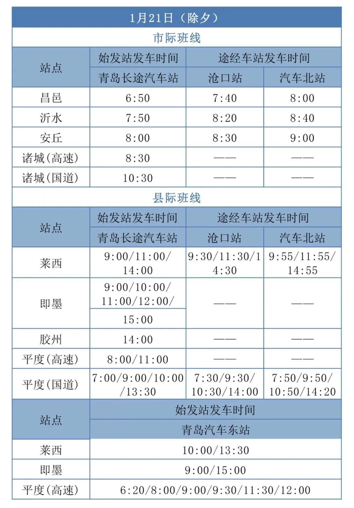 除夕当天保留昌邑、沂水、安丘、诸城等市际班线运行,正月初一只有平度、莱西、即墨、胶州等县际班线运行,正月初二开始市际班线陆续恢复运行。青岛沧口汽车站正月初一所有班次暂停发车。