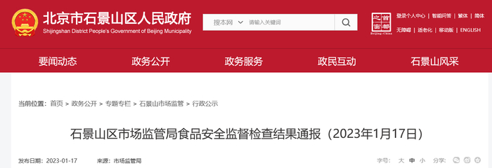 北京市石景山区市场监管局食品安全监督检查结果通报(2023年1月17日)
