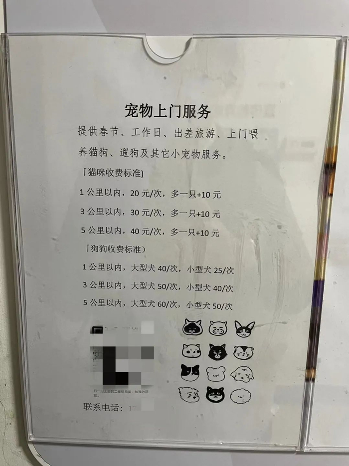 除了宠物寄养,宠物上门喂养也变得流行。在不少社区的楼道、电梯等位置及各类线上平台,出现了宠物代喂的广告。广告单显示,提供春节、工作日等上门喂养猫狗、遛狗及其他小宠物服务。收费按照宠物种类、上门距离有所不同,如5公里内的大型犬喂养60元/次,小型犬喂养50元/次。猫巷小程序显示,距离2公里内的上门喂养收费在40-80元之间,一位五星级“超赞宠托师”的上门喂养则140元/次起步。