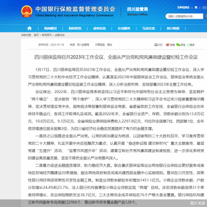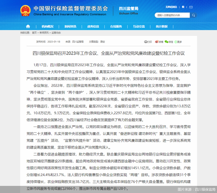 北京商报讯(记者 陈婷婷 胡永新)1月18日,四川银保监局发布信息显示,1月17日,四川银保监局召开2023年工作会议,会议指出,截至2022年末,全省保险业原保险保费收入2297.8亿元。2022年农业保险赔款支出38.7亿元,三大主粮完全成本保险在76个产粮大县全覆盖。