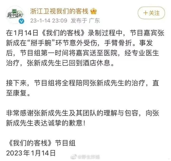 近日,演员张新成录制综艺节目时,在“掰手腕”环节意外手臂骨折。