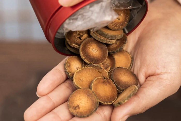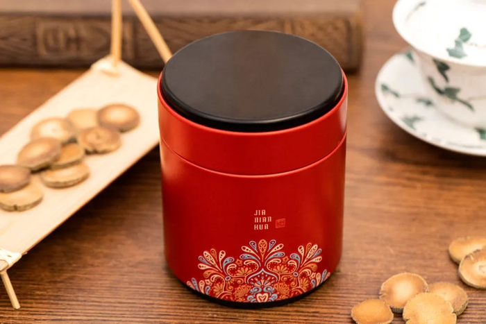 再经传统古法十八道工序慢火烘焙而成橘红干果,再密封储存陈化,食用时再出仓成型切片饮用。