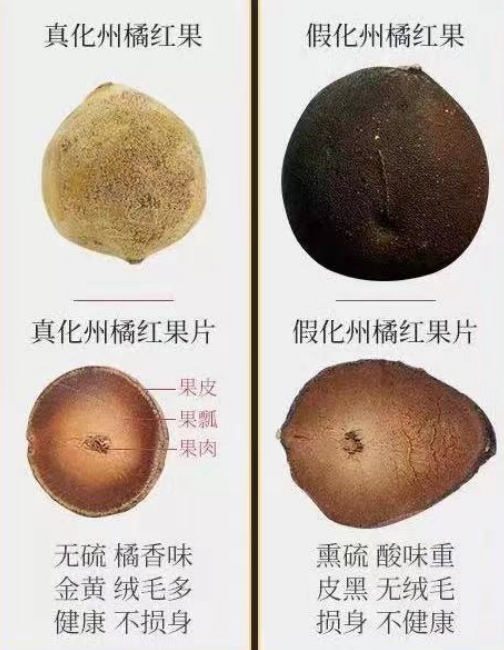 即使烘干切片后,化红橘片的皮上依然会有毛茸茸的细绒,这也是区分化橘红和普通橘红的办法。