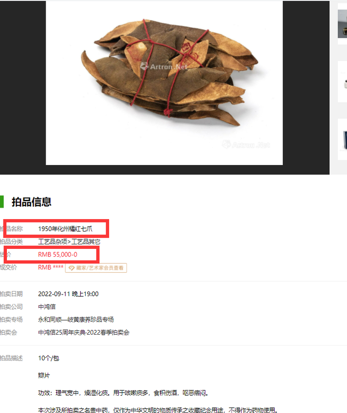 时至今日,2022年9月份的一个拍卖名称叫做:“1950年化州橘红七爪”的产品,起拍价高达55,000元