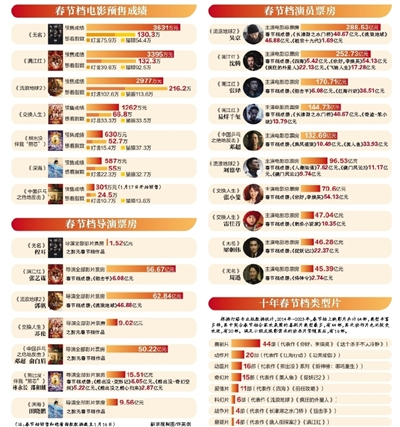 今年春节档的演员中,吴京主演电影总票房最高,达288.53亿元,而沈腾是出演春节档电影次数最多的演员,成为春节档“钉子户”,连续4年主演了春节档5部影片(因疫情原因,2020年春节档不包含在内),包括《飞驰人生》(2019)、《疯狂的外星人》(2019)、《你好,李焕英》(2021)、《四海》(2022)、《满江红》(2023)。新京报记者 滕朝