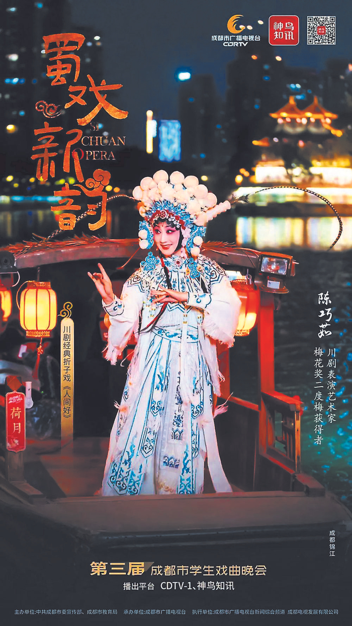 1月16日在成都电视台播出的《蜀戏新韵——第三届成都市学生戏曲晚会》,也是充分运用创意视频、戏曲游唱突破舞台时空所限。“夜游锦江”中的川剧名家陈巧茹演唱“站在船头观锦绣,千红万紫满神州”,讴歌人间美好;二度梅得主刘芸指导学生带来川剧戏歌舞《谷雨》,二十四节气与川剧戏歌舞精巧融合……从某种意义上说晚会也是一部以戏曲元素为视觉主线,老中青三代川剧人奉献的成都城市形象宣传片。