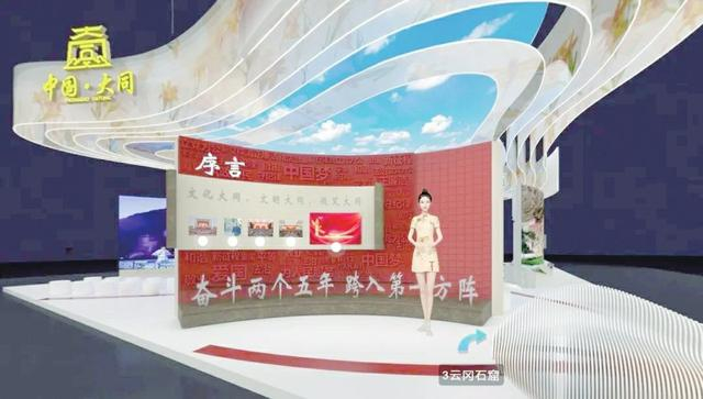 大同展厅立足大同悠久历史、地域文化和时代背景,以“文化大同、文明大同、微笑大同”为主题。展厅共有10个板块,分别为序言、主屏幕、云冈、恒山、古城、文化产品、文化服务体系、文化产业、古长城、文化+。以丝绸纱幔为造型,象征大同见证“丝绸之路”东端繁华盛景的源远流长和这座城市包容兼蓄的精神特质;以市花“黄花”作点缀,象征新时代大同的含苞待放、欣欣向荣;天幕穹顶以“大同蓝”为背景,意境高远而格调明朗,象征大同以璀璨文化之光照亮高质量发展之路。展厅设计理念既体现大同文脉、彰显大同文韵、充盈大同文气,又充分利用人工智能、3D、VR全景等现代新媒介技术手段,融观赏性、融入式、体验感于一体,集展示、交易、交流、互动为一馆,将大同展厅打造成为吸引广大网民走进大同、了解大同、游历大同、乐享大同的良好载体和云上平台。