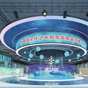 山西综改示范区云展厅,以“文化科技融合推动高质量发展”为主题,主要由主形象展区、二十大金句通道、企业展区、综改区展示区四部分构成。主形象展区设置多媒体设备、大屏音箱等设备,直观展示山西综改示范区宣传视频,落地立体字及发光结构立体字展示山西综改示范区推动高质量发展。二十大金句通道结构与党的二十大精神相结合,展现山西综改示范区全面贯彻落实党的二十大精神。企业展区内,21家企业携16类150余种产品,以液晶显示器(视频)、图文展板(图册)结合的形式,突出展示山西综改示范区优质文化产业项目和优秀文化产品。综改区展示区通过山西综改示范区推进文化产业高质量发展的工作规划与成就,全面展示文化产业最新发展成果。