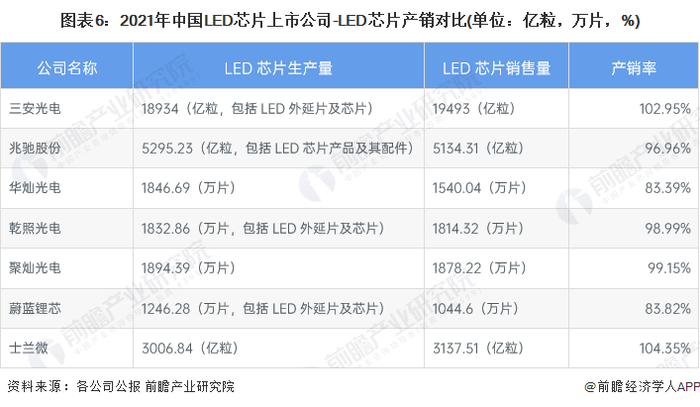 从企业LED芯片相关产品产销量来看,2021年,三安光电和士兰微LED芯片相关产品产销率最高,分别达102.95%和104.35%,三安光电2021年生产18934亿粒芯片,销量达到19493亿粒;其次,聚灿光电产销率达到99.15%,LED芯片产销分别为1894.39万片和1878.22万片。