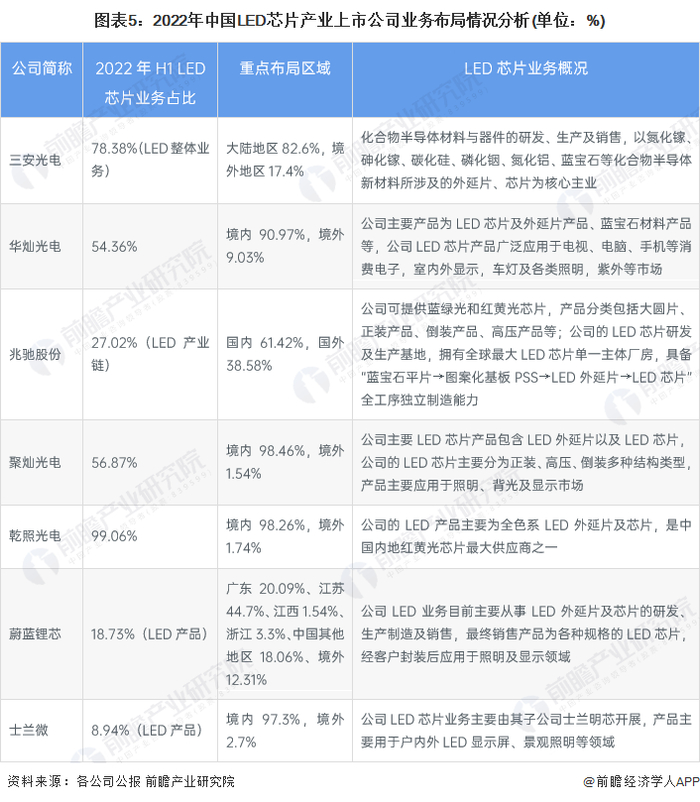从销售网络布局来看,LED芯片行业的上市公司中,大多数上市公司在国内外均有布局,但主要市场集中于国内。在LED芯片业务占比方面,三安光电、乾照光电LED芯片业务占比最高,分别达到了78.38%和99.06%。