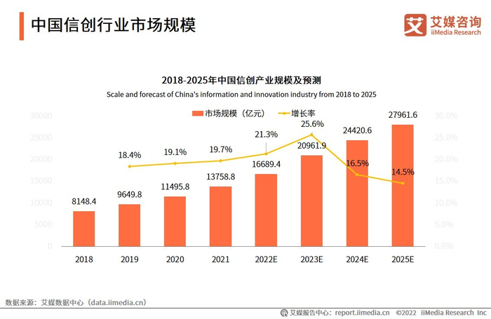 根据艾媒咨询数据,2020 年我国信创市场规模为 1.15 万亿,随着“十四五”将信创作为国家重大战略的一环,2023 年市场规模可达 2.1 万亿,年增长率超 25%。