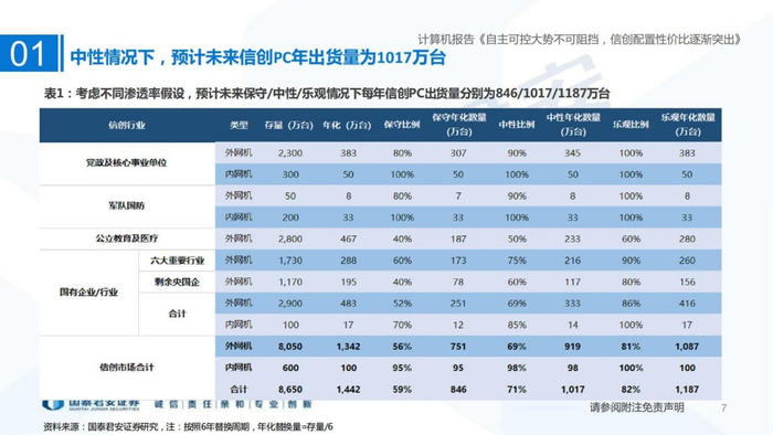 据国泰君安证券预测,信创 PC 的潜在替换空间可达“2+8”重点行业 8650 万台,叠加央国企 3000 万台,中性情况下信创PC年出货量为1017万台。随着央国企行业信创的全面铺开,信创产业的规模将进一步快速提升,即将迎来常态化、规模化的采购新高潮。