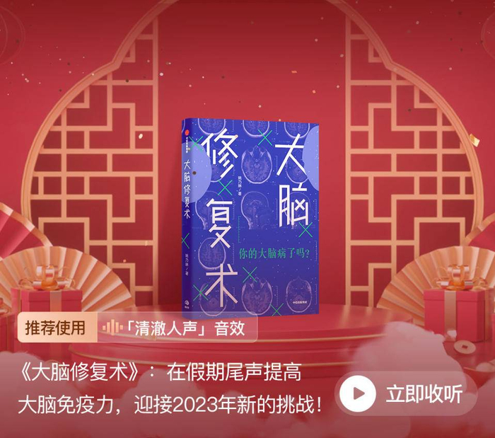 大年初六是很多人假期的最后一天,很多人都将不得不告别短暂的假期,重新去面对学习、工作、生活中的糟心事儿。如何更轻松地应对高压环境,提升自己的工作和学习表现?如何火速跨过假期综合症,在职场、高校里再次焕发你英姿飒爽的风采?初六讲解的这本《大脑修复术》将帮助大家提高大脑“免疫力”,更游刃有余地应对生活中层出不穷的挑战。