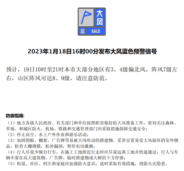 大风蓝色预警中,今天本市北风较大,风寒效应显著,出行请注意防风保暖,防范高空坠物,并注意用火安全。