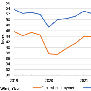 较少的受访者认为很容易就能够找到工作,只有一小部分人认为求职前景会有所改善。中国人民银行的“当前”和“未来”就业情绪指数于2022年第二季度跌破2020年的低点,随后进一步下降,在2022年第四季度达到新低(图1)。