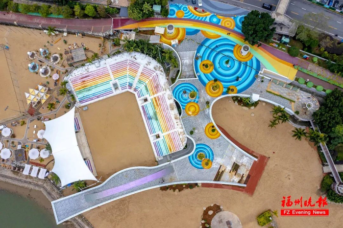“这是市区首个以彩虹色调为主题的江景平台”,李翔介绍,一旁的沙滩排球场座位区座椅色调也进行了改造,以七彩颜色装点,更显活力。