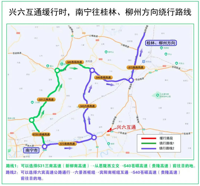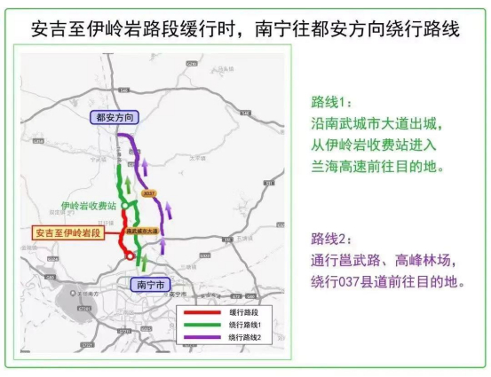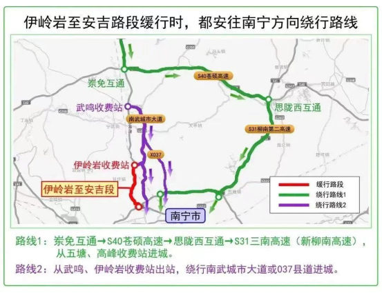 路线2:从武鸣、伊岭岩收费站出站避开拥堵路段,绕行南武城市大道进城;或者是绕行037县道,走邕武路进城。