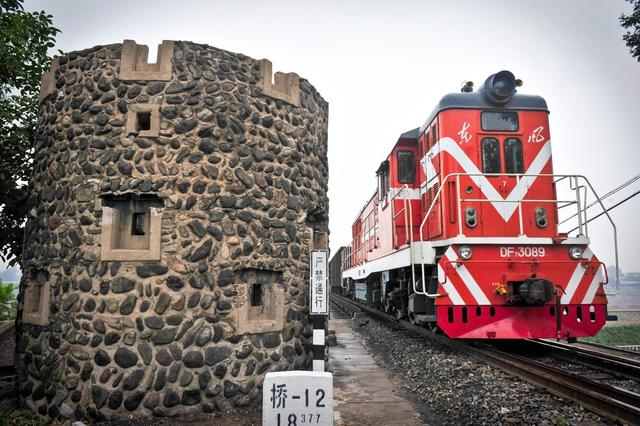 列车驶过京门铁路旁的碉堡遗址