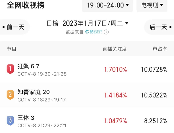 1月14日开播至今,《狂飙》已经连续4天登顶全国黄金时段收视榜,收视率力压紧随其后开播的热门剧《三体》,但全网讨论热度不及后者。