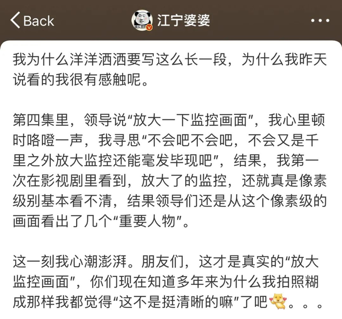 最让@江宁婆婆 惊喜的是,他第一次在影视剧里看到,警察放大了的监控“还就真是像素级别基本看不清”,“这一刻我心潮澎湃。朋友们,这才是真实的‘放大监控画面’”。
