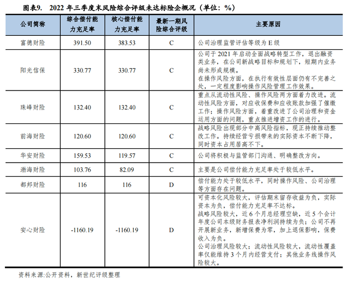 风险综合评级方面,在偿二代监管规则II下,险企风险综合评级由A、B、C、D四类细化为AAA-A、BBB-B、C、D八类。根据银保监会统计数据,2022年三季度末,43家保险公司风险综合评级为A类,114家为B类,15家为C类,9家为D类。从已披露偿付能力报告的83家产险公司看,AAA产险公司6家(安信农险、三井住友、东京海上、日本财产、凯本财险、美亚保险),C类产险公司6家(富德财险、阳光信保、珠峰财险、前海财险、华安财险、渤海财险)、D类2家(都邦财险、安心财险),低于监管要求(B类)的险企数量同比明显增加(2021年三季度末,在已披露偿付能力报告的83家产险公司中,有3家低于监管要求的B类,其中,阳光信保和渤海财险为C类,安心财险为D类)。各风险综合评级未达标险企情况如下表所示。