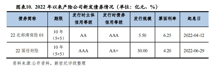从行业发债补充资本情况看,2022年,产险行业共新发债券2只,发债主体分别为北部湾财产保险股份有限公司和国任财产保险股份有限公司,发行规模分别为5.50亿元和30.00亿元。